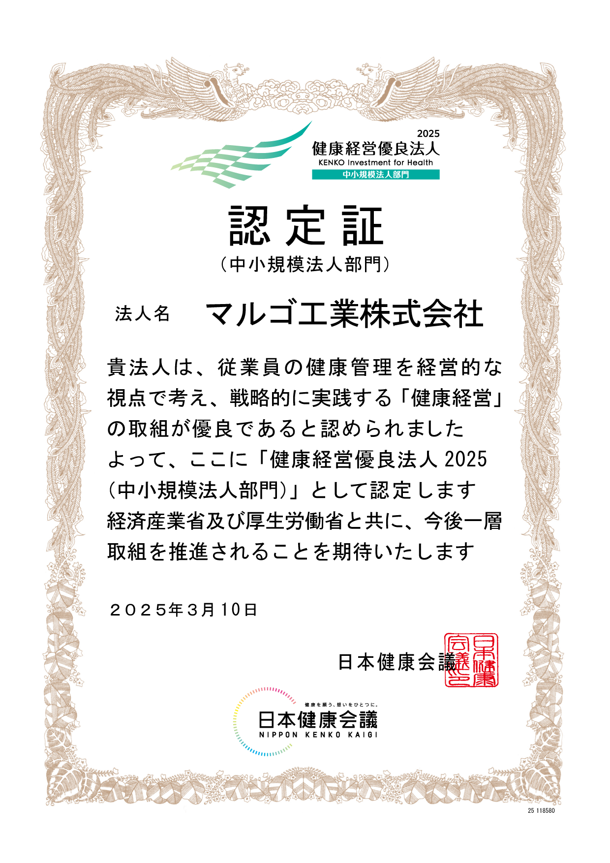 マルゴ工業株式会社は優良な健康経営を実践している法人として、経済産業省と日本健康会議が選定する「健康経営優良法人2025(中小規模法人部門)」に認定されました。